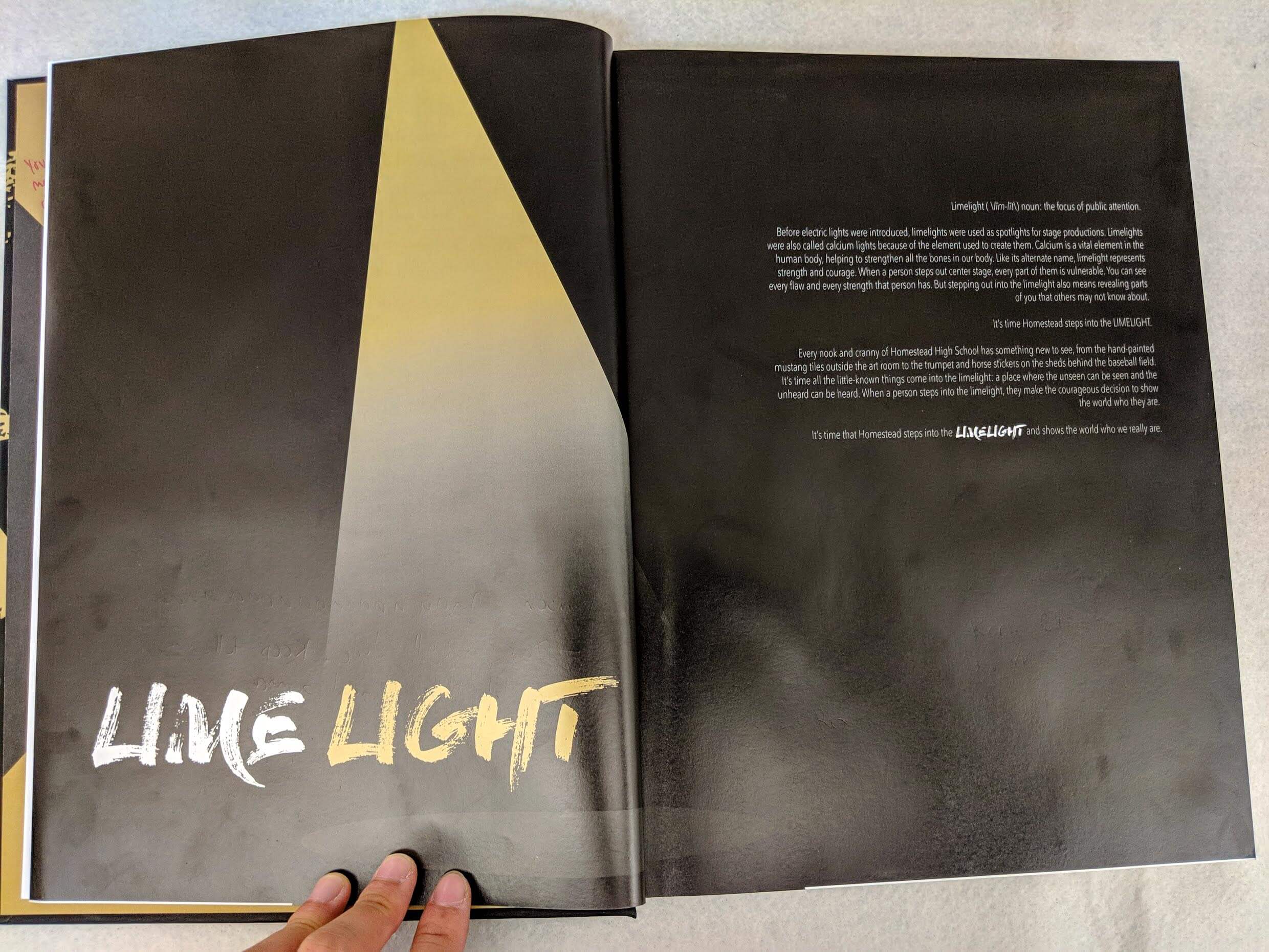 This project was a collaborative effort among 14 students. The Homestead Yearbook, or any yearbook, captures everything that happened in the school during the year. Throughout the creation of the yearbook, I was put in charge over designing the cover, front endsheet, opening, divider, colophon, closing, and back endsheet. Our yearbook theme for that year was "Limelight", in which we wanted to capture the little things, put a spotlight on the things you don't normally see. I utlilized the design concept of the rotated square as a "limelight". I put the square infront of a faded image and a colored image infront of the square to give the illusion of a popout.